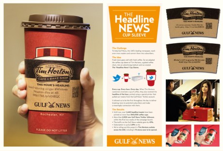 Quale miglior modo per far girare le notizie fresche, se non appiccicate al bicchiere del caffè della mattina? Parliamo di bicchiere perchè è una tradizione tutta americana e americana è la trovata di stampare le ultime news proprio sul cartoncino che avvolge il caffè. Un cambio notizia ogni ora e un QR per leggere gli approfondimenti.