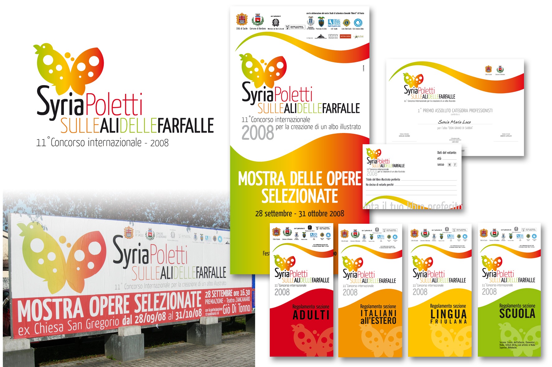 La mostra evento in oggetto è nata dalla collaborazione di due comuni friulani: Sacile e Bordano. Il concorso per la creazione di un albo illustrato di Bordano, si è unito alle commemorazioni della sacilese Syria Poletti. Da questa premessa è stato creato il logo che simboleggia proprio questa collaborazione: un uccello (rappresentativo della città di Sacile per la famosissima Sagra degli Osei) che si fonde con una farfalla (simbolo d’eccellenza per il comune di Bordano). Dopo aver creato il logo, sono state realizzati tutti i materiali per la diffusione del concorso, dèpliant, regolamenti, poster, striscioni, 6×3. Poi c’è stata una seconda fase in cui abbiamo comunicato gli esiti del concorso creando le locandine per evento di chiusura, i diplomi, gli attestati, l’allestimento della mostra… In questo caso, la collaborazione con il gruppo MakeaMove Communication, ha supportato l’ebento nella diffusione delle informazioni, riuscendo a far parlare dell’evento, anche il quotidiano Il Mattino di Napoli.